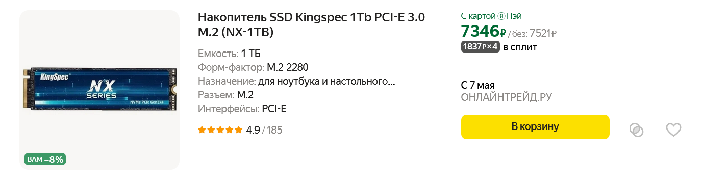 Растут системные требования игр и в плане занимаемого объема, и SSD-накопитель на 1 ТБ уже совсем не кажется излишеством в 2024 году, а скорее — минимальным необходимым объемом. Ведь помимо игр, нужно место еще и под Windows и файлы пользователя. В эту сборку отлично впишется KINGSPEC NX-1TB, одна из самых популярных и недорогих моделей с неплохой скоростью.