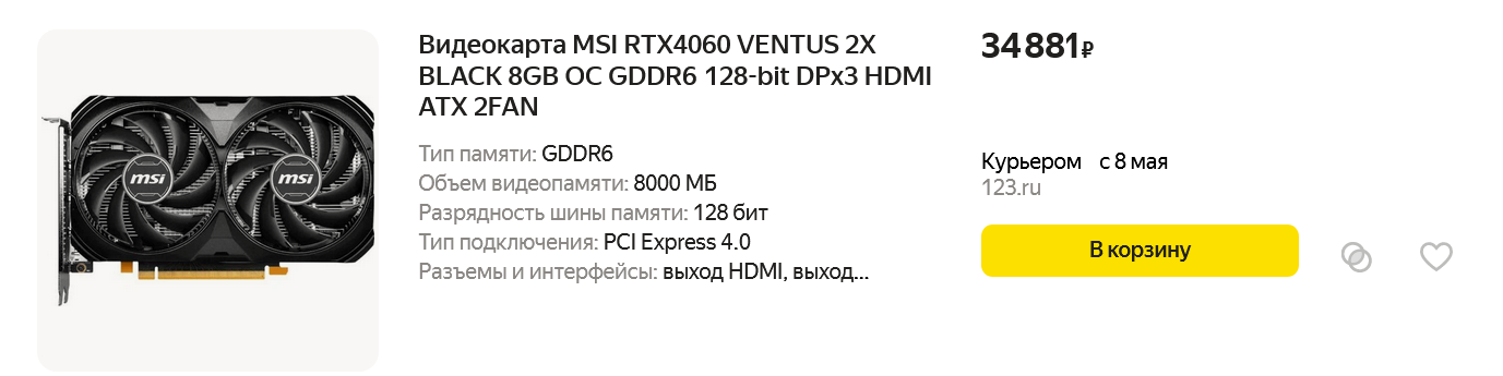 Судя по свежей статистике Steam, видеокарты от AMD никак нельзя назвать народными — их доля составляет всего 15.79%. Геймеры привыкли к видеокартам от Nvidia, и готовы даже доплатить за шильдик зеленого цвета. Поэтому в нашем ПК будет стоять GeForce RTX 4060, одна из самых оптимальных "зеленых" моделей по соотношению цены и производительности. В исполнении от компании MSI — MSI GeForce RTX 4060 VENTUS 2X BLACK 8G OC.