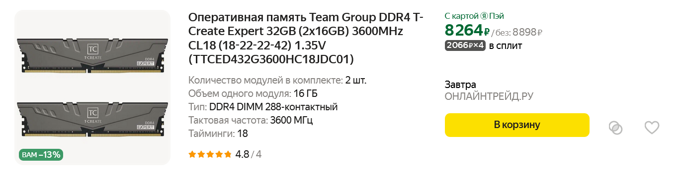 Последние новинки игр с трудом укладываются в 16 ГБ ОЗУ, а некоторые даже начинают фризить на таком объеме, поэтому в народном игровом ПК весны 2024 года должно стоять 32 ГБ памяти. Тем более, что в нашем случае это будет недорогая DDR4 и переплата за дополнительный объем будет очень небольшая. Зато с таким объемом ОЗУ вы можете не беспокоиться о ее нехватке еще лет пять, как минимум. Оптимальной частотой для Ryzen 5 5600 станет 3600 МГц, а вот гнаться за низкими таймингами не стоит — это обойдется в чувствительную сумму, поэтому мы возьмем модули Team Group DDR4 T-Create Expert, с таймингами 18-22-22-42.