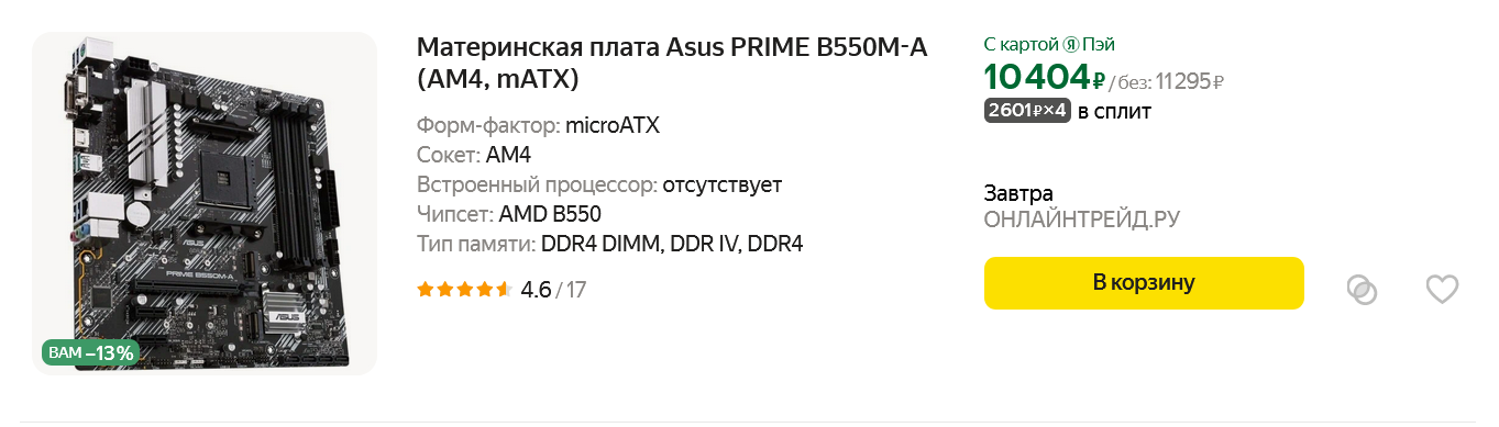 За материнскую плату мы немного переплатим, выбрав модель на чипсете AMD B550 с поддержкой шины PCI Express 4.0. Иначе с новыми видеокартами среднего уровня, у которых всего 8 ГБ видеопамяти и всего восемь линий PCI Express для подключения, можно потерять 10-15% FPS в тяжелых играх и получить фризы, которые испортят впечатление от игрового процесса. Это будет Asus PRIME B550M-A, качественная и недорогая модель, у которой есть все, что нужно народному игровому ПК.