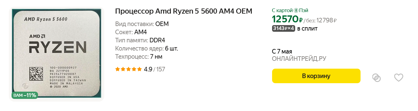 Шестиядерник Ryzen 5 5600 уже давно присутствует на рынке и, несмотря на то, что появились новые, гораздо более быстрые процессоры, по соотношению цены и производительности ему пока нет равных. Его хватает для всех новых игр, в которых он способен обеспечить стабильные 60 и больше FPS вместе с достаточно мощными видеокартами. В плюсы этой модели можно записать и невысокое энергопотребление, на фоне прожорливых новинок Ryzen 5 5600 выглядит очень экономичным и холодным процессором.