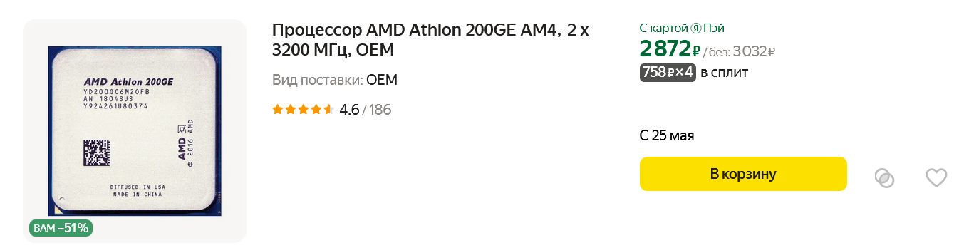 Athlon 200GE может стать основой для ультрабюджетного ПК, ведь он стоит уже дешевле 3000 рублей. И за эти деньги вы получаете два ядра и четыре потока, которые справятся с массой рабочих задач и игр, а встроенное графическое ядро позволит поиграть во многие игры до 2015 года выпуска, ведь по производительности Vega 3 обходит не только "встройку" Intel HD Graphics 610, но и дискретную видеокарту GeForce GT 730.