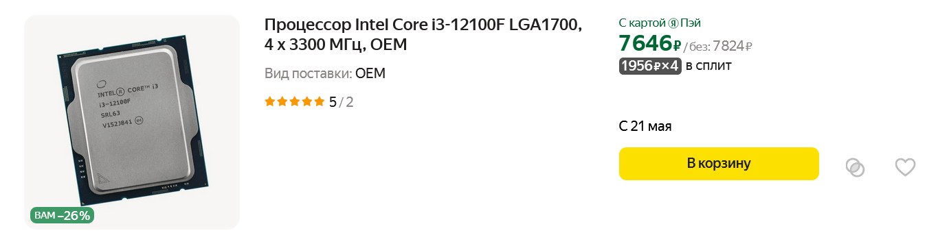 А следующая модель — Core i3-12100F, недавно засветилась в моем блоге Собираем недорогой игровой компьютер, который позволит за копейки поиграть во все новые игры, где в пару к нему была выбрана видеокарта Radeon RX 6600. Несмотря на всего четыре ядра и столь низкую цену, этот процессор позволит вам без проблем пройти все новые требовательные хиты, главное — подобрать для него достаточно мощную видеокарту.