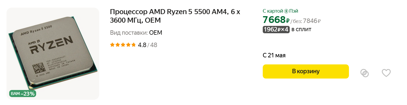 Постоянные читатели моих блогов уже знают, какой процессор будет следующим, ведь Core i3-12100F всегда "ходит парой" вместе со своим главным конкурентом — Ryzen 5 5500. И выбор между ними очень сложен, ведь если Core i3-12100F дает поддержку шины PCI Express 4.0 для новых видеокарт, то Ryzen 5 5500 — уже имеет шесть полноценных ядер и возможность легкого разгона. Ну а в играх они идут ноздря в ноздрю и способны полноценно работать даже с видеокартами уровня Radeon RX 7600 или GeForce RTX 4060.