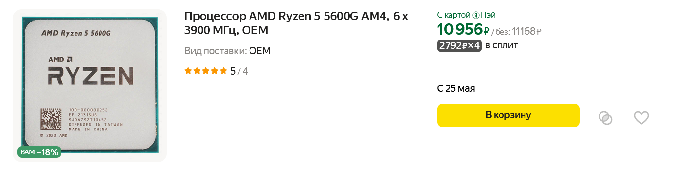 После выхода новых процессоров со встроенной графикой от AMD — Ryzen 5 8500G, Ryzen 5 8600G и Ryzen 7 8700G для платформы AM5, популярная модель прошлого поколения, Ryzen 5 5600G, начала дешеветь и стоит уже почти 10000 рублей. И это отличная цена за такую производительность, которую обеспечивают шесть ядер и графика Radeon Vega 7, которая за счет высокой частоты почти дотягивается до уровня дискретной видеокарты GeForce GTX 1050. Для геймеров, которые играют в нетребовательные игры — это отличный выбор. А еще Ryzen 5 5600G позволит пересидеть несколько месяцев на встроенной графике, а затем установить в ПК заметно подешевевшие видеокарты Radeon RX 6600 или GeForce RTX 3060.