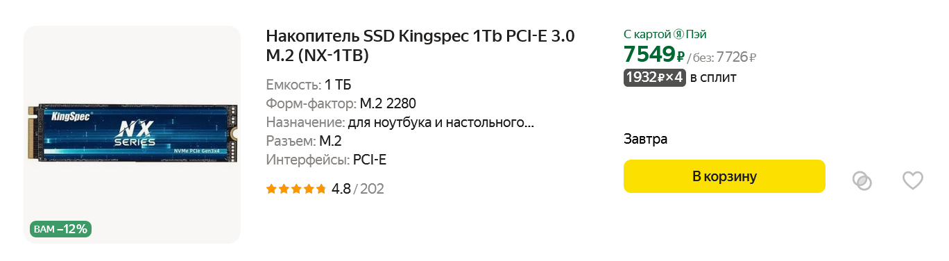Еще один SSD от компании Kingspec — Kingspec NE-1TB объемом 1 ТБ, уступает по характеристикам самому популярному SSD нашей подборке от той же компании, но и стоит дешевле. Скорость чтения у него достигает 2400 МБ/с, записи — 1900 МБ/с, а вот ресурс перезаписи уже вполне приличный и равен 600 ТБ.