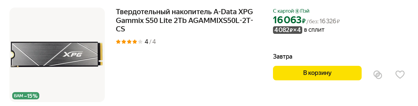 Самый дорогой накопитель этого блога объемом 2 ТБ — ADATA XPG GAMMIX S50 Lite, расположился на втором месте по популярности. Его скорость чтения достигает 3900 МБ/с, записи — 3200 МБ/с, а вот ресурс перезаписи довольно небольшой для SSD такого объема — 740 ТБ.