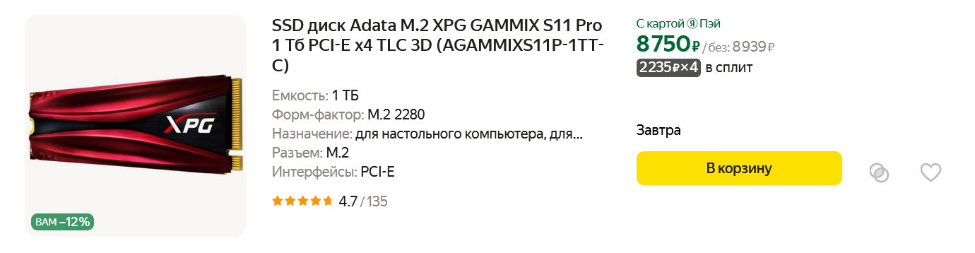На третьем месте расположился SSD ADATA XPG GAMMIX S11 Pro объемом 1 ТБ, довольно старая модель с интерфейсом PCI Express 3.0, скоростью чтения до 3500 Мбайт/сек, записи - 3000 Мбайт/сек, и ресурсом перезаписи в 640 ТБ. Модель интересна наличием DRAM-буфера объемом 1000 МБ.