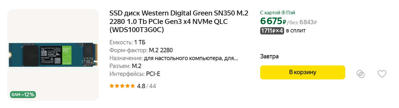 Western Digital Green SN350 в иерархии накопителей Western Digital занимает ступеньку ниже, чем WD Blue, но предлагает самый дешевый 1 ТБ объема в нашей подборке. Скорость чтения у этого накопителя достигает 3200 МБ/с, записи — 2500 МБ/с, а вот ресурс записи очень мал, всего 100 ТБ, и за счет этого его можно рекомендовать только в офисные ПК.