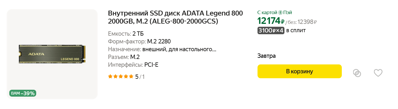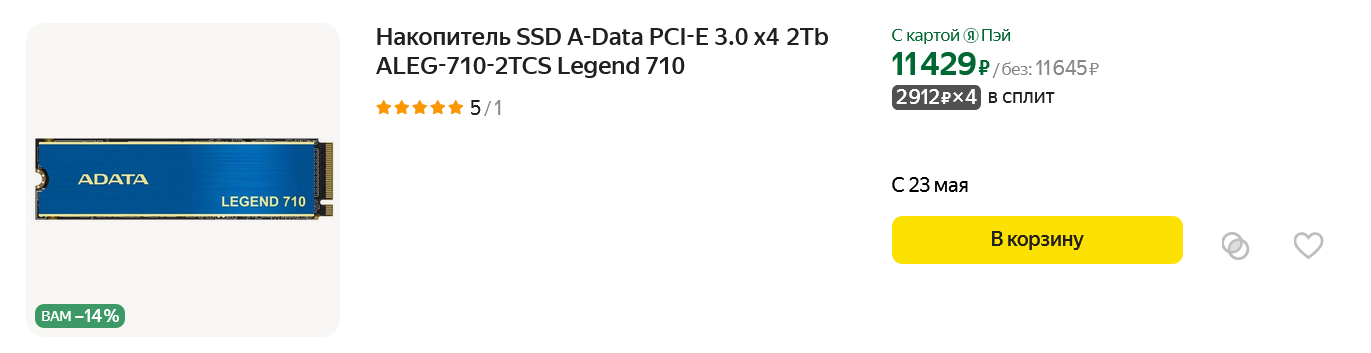Еще один накопитель от ADATA — ADATA Legend 710, предлагает самый дешевый объем в 2 ТБ из SSD в нашем списке, всего за 11429 рублей. Скорость чтения у этой модели достигает 2400 МБ/с, записи — 1800 МБ/с, а ресурс записи небольшой, всего 520 ТБ.