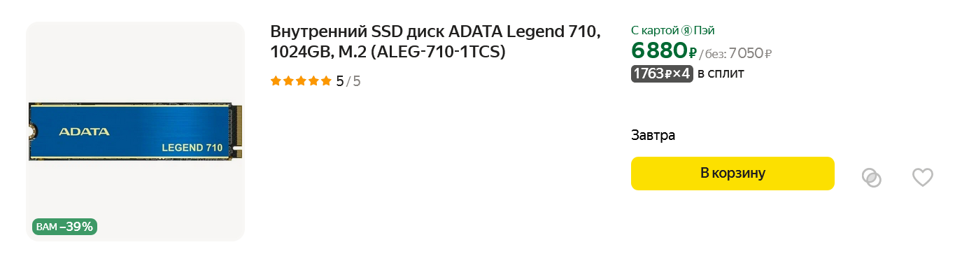 SSD ADATA Legend 710 объемом 1 ТБ — типичный бюджетник со скоромными характеристиками. Скорость чтения этой модели составляет 2400 МБ/с, записи — 1800 МБ/с, а ресурс перезаписи (TBW) — 260 ТБ, что довольно мало для SSD такого объема.