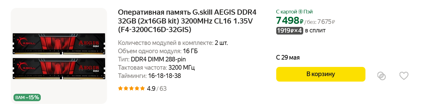 32 ГБ оперативной памяти DDR4 с частотой 3200 МГц обойдутся всего в 7498 рублей, к примеру, G.skill AEGIS.