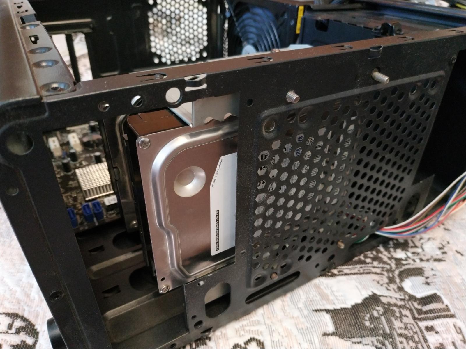 После установки материнской платы ПК выглядит весьма неплохо — но основные проблемы еще впереди. Нужно впихнуть в этот компактный объем пару жестких дисков, тогда как у него нет креплений даже для одного — они банально потерялись. Раньше я выходил из положения, прикручивая жесткий диск вертикально к решетке переднего вентилятора, но два жестких диска там никак не уместятся. Почему именно два? Просто их объем небольшой, всего 80 и 250 ГБ, и они будут забиты фильмами и сериалами, а в будущем хотелось бы использовать этот ПК как сервер для бэкапа, установив более емкие диски. Выход был найден — корзина для жестких дисков от старого корпуса, установленная вертикально.