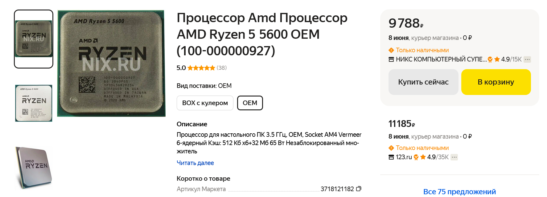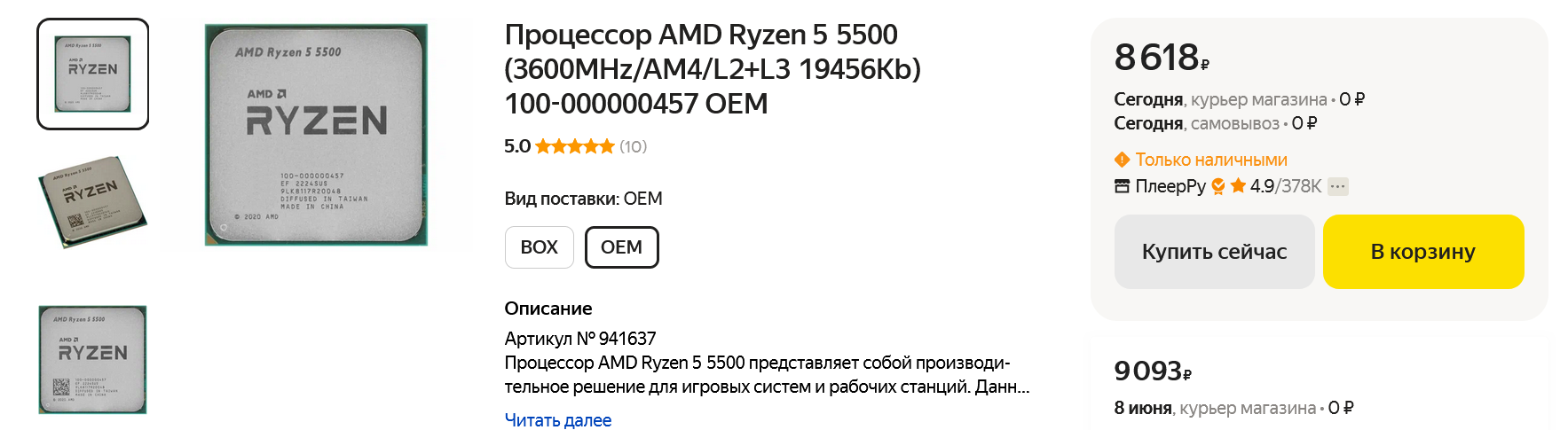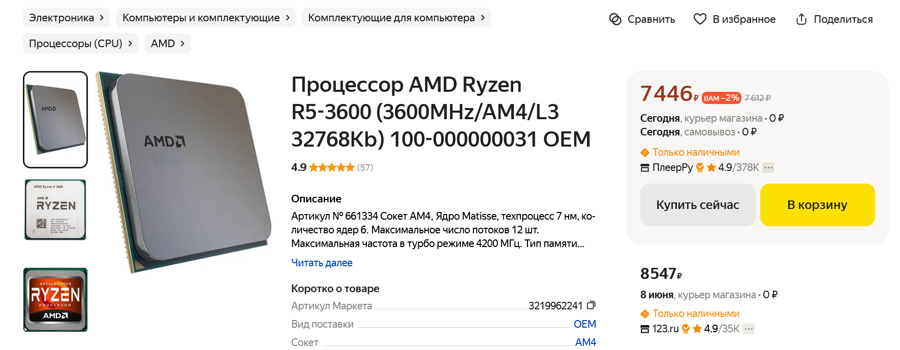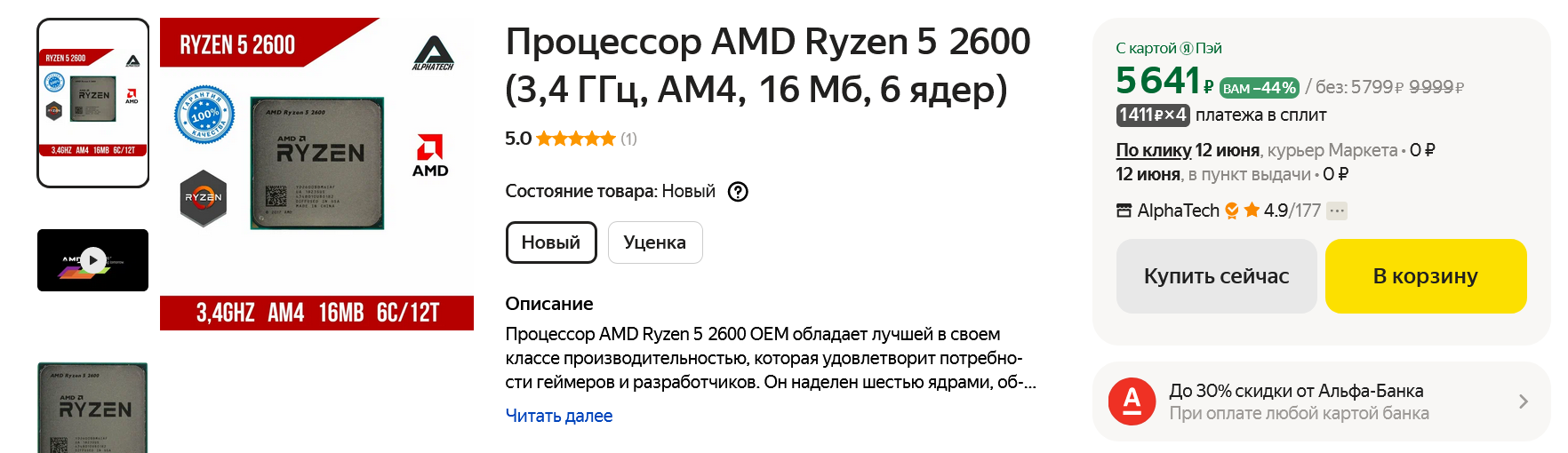 Даже в 2024 году на Яндекс Маркете, AliExpress, Ozon и других маркетплейсах можно найти старые процессоры Ryzen 5 1600 и Ryzen 5 2600 с архитектурой Zen и Zen+. Но, несмотря на привлекательную цену, покупать их не стоит — производительность на ядро у них очень низка, а вот энергопотребление весьма приличное. Да в и играх они показывают себя гораздо хуже, чем шестиядерник следующего поколения — Ryzen 5 3600. И если вам нужна ультрабюджетная сборка, то даже четырехъядерник Core i3-10100F будет гораздо предпочтительнее — холодный, нетребовательный к материнской плате и более быстрый в большинстве игр.