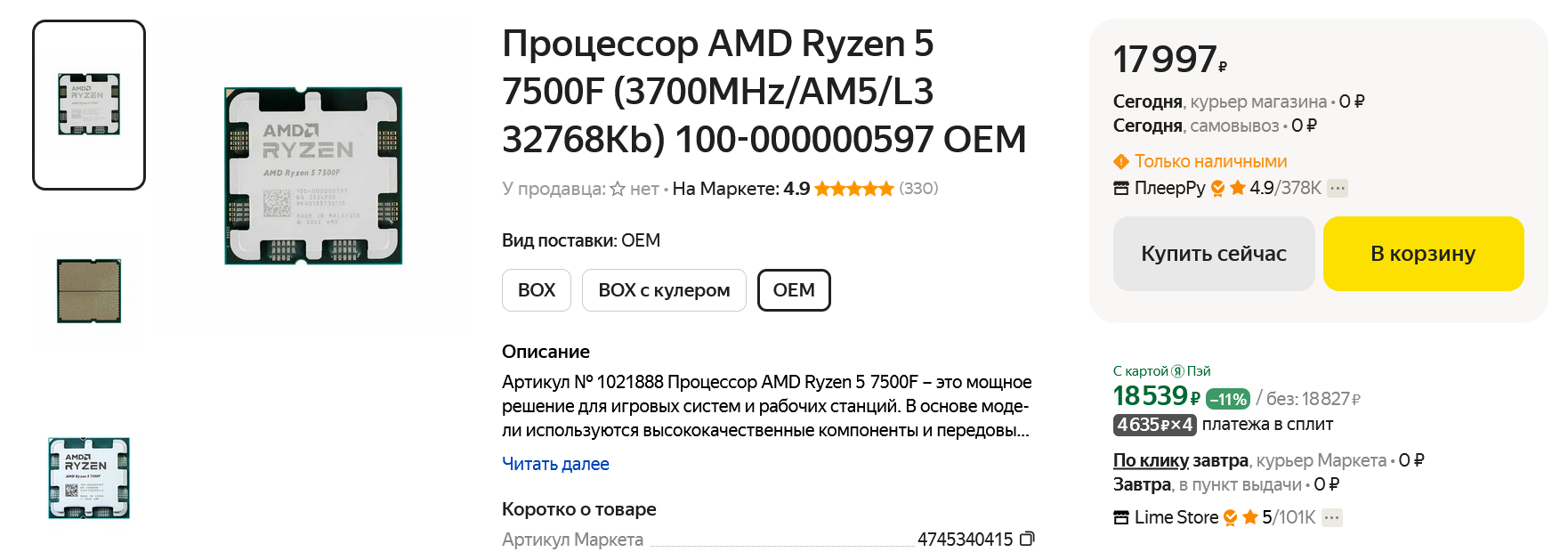 И если вы задумываетесь о покупке Ryzen 5 7500F, не спешите и поищите Ryzen 5 7600 — эту модель иногда можно найти всего на 300 рублей дороже. И получить за это встроенную графику AMD Radeon Graphics и чуть более высокие частоты определенно стоит.