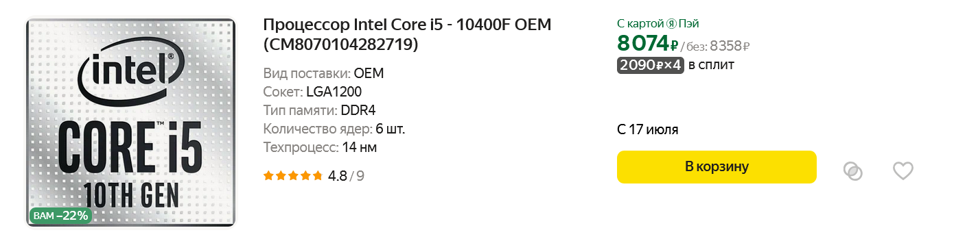 Шестиядерник Core i5-10400F для платформы LGA 1200 появился на рынке в 2020 году, и отлично конкурировал с Ryzen 5 3600, но быстро сошел со сцены, будучи вытесненным гораздо более быстрыми моделями для сокета LGA 1700. Что интересно, его до сих пор можно найти в продаже и по весьма вкусной цене, и для сборки на основе видеокарты уровня GeForce RTX 3050 или Radeon RX 6600 он отлично подойдет.