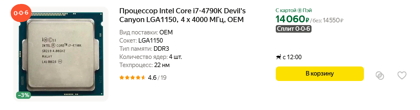 Четырехъядерный и восьмипоточный Core i7-4790K появился еще в 2014 году, в те времена, когда доллар стоил 33 рубля и позволить себе эту модель, как и предшественника — Core i7-4770K, могли довольно многие геймеры. В отличие от легендарных Core i7-2600K эти процессоры поддерживают большее количество нужных современным играм инструкций, и за счет восьми потоков и приличной частоты выдают вполне неплохой FPS. Что интересно, эту модель до сих пор можно найти в продаже на маркетплейсах.