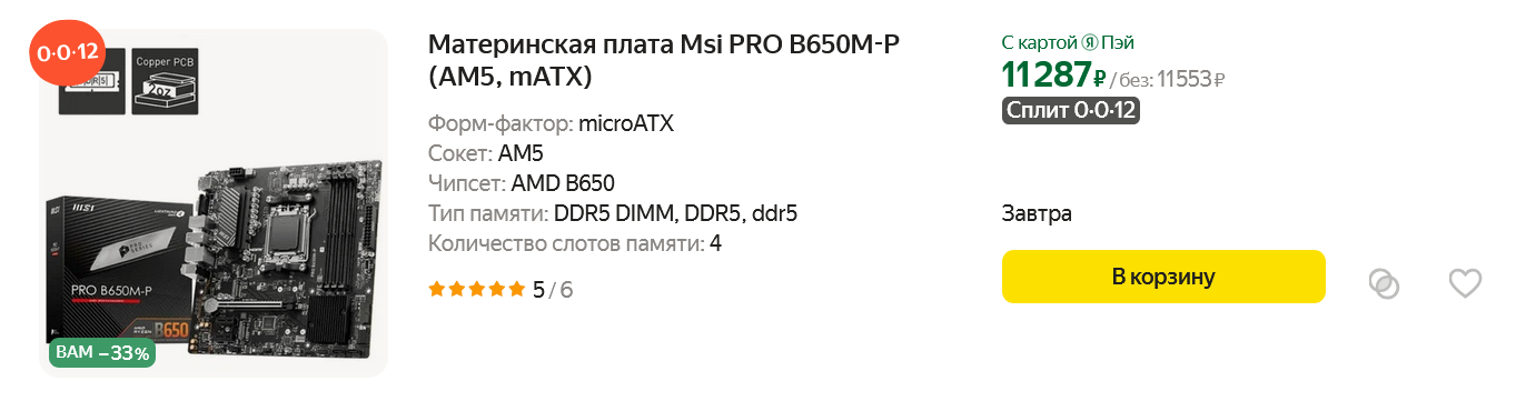 А вот материнские платы для платформы AM5 наконец-то начали дешеветь, а ведь их дороговизна, наряду с недешевой памятью DDR5 была одним из главных минусов этой платформы от AMD. Например, отличную плату MSI PRO B650M-P мне удалось найти всего за 11287 рублей, что является очень привлекательной ценой за модель с чипсетом AMD B650. Плата имеет радиатор на цепях VRM, два разъема под современные накопители M.2, и четыре разъема DIMM, что позволит в будущем добавить оперативной памяти. Еще эта модель может похвастаться "сетевухой" на базе чипа Realtek RTL8125BG со скоростью 2.5 Гбит/с.