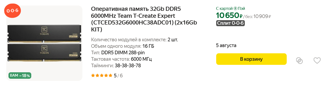 После все новых и новых проблем с процессорами от Intel, переплачивать за их продукцию совсем не хочется, ведь если выяснится, что у них деградируют не только Core i7 и Core i9, но и Core i5 — это будет просто катастрофа на рынке процессоров. Поэтому наш выбор — Ryzen 5 7500F, проверенный временем шестиядерник для платформы AM5, которой справляется со всеми требовательными играми. Но и этот процессор преподнес неприятный сюрприз — я не заходил на Яндекс Маркет несколько дней, и подбирая комплектующие для это сборки, обнаружил, что найти Ryzen 5 7500F за 15000-16000 рублей уже не получится. Цены растут, а что будет к первому сентября, когда огромное количество покупателей пойдет в магазины за "компьютерами для учебы", даже страшно представить.