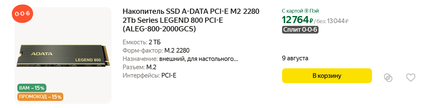 Выбирая SSD-накопитель в игровой ПК, гонитесь в первую очередь за объемом и сроком гарантии, а не за скоростью. Заметить разницу между бюджетным и топовым M.2 NVMe SSD в играх не получится, она видна на практике только при копировании огромных объемом данных. Отличным середнячком стал SSD A-DATA LEGEND 800 (ALEG-800-2000GCS), объем которого составляет целых 2 ТБ. Этого хватит очень и очень надолго и размер новых игр не будет вас пугать еще лет пять. Эта модель выдает скорость 3500 Мбайт/сек при чтении, 2800 Мбайт/сек — при записи, а параметр перезаписи равен внушительной цифре в 1200 ТБ. Но даже с таким параметром перезаписи качать торренты на SSD-накопитель рискнет не каждый геймер, а после блокировки YouTube это делать нам придется гораздо все чаще.