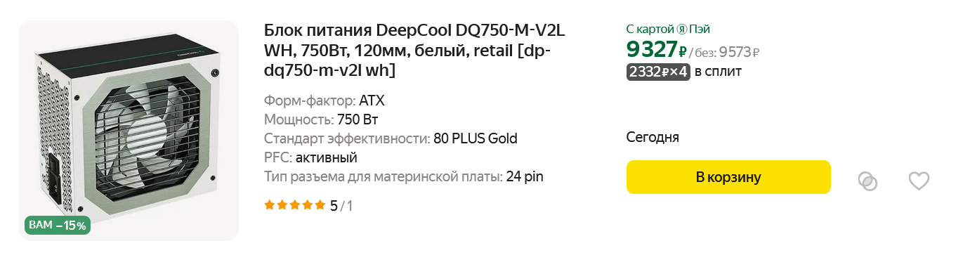 Такая дорогая сборка, как наша, требует только самого качественного блока питания, ведь рисковать комплектующими, ставя к ним бюджетный БП, который может сгореть и забрать их с собой, никак нельзя. Одной из оптимальных моделей блоков питания, сбалансированных по качеству, мощности, цене и акустическим характеристикам, является DeepCool DQ750-M-V2L WH. Это блок питания с "голдовым" сертификатом, возможностью отключить абсолютно все провода, и выдающий по линии 12 вольт практически всю свою мощность — 744 ватта. И, конечно же, за такую цену вы получите японские конденсаторы и защиты OCP, OPP, OTP, OVP, SCP и UVP — за здоровье наших комплектующих с этим БП можно не переживать.