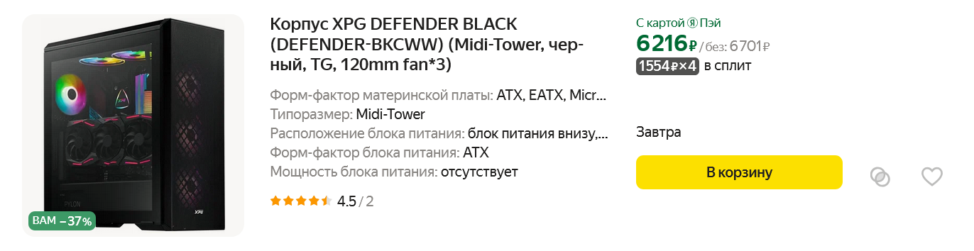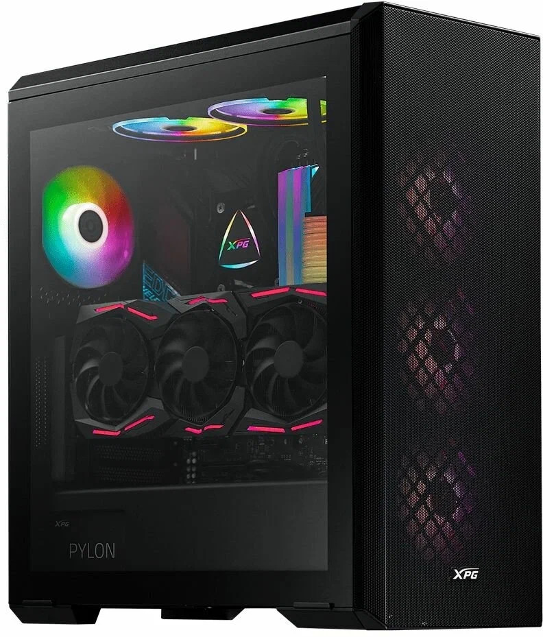 Подбирая корпус для этой сборки, мне захотелось чего-нибудь более оптимального, чем корпуса DEEPCOOL MATREXX, которые начинают доминировать на рынке в среднем ценовом сегменте. Тем более, что в продаже они встречаются как с полным набором вентиляторов, так и без, и разница в цене при этом очень чувствительна. И, долго перебирая корпуса на Яндекс Маркете, я нашел XPG DEFENDER BLACK — отличную модель, очень вместимую, с замечательной вентиляцией, которая понадобится нашей GeForce RTX 4070 и с превосходным строгим дизайном. Три "вертушки" типоразмера 120 мм в корпусе уже есть, но я добавил бы еще парочку для того, чтобы настроить вентиляторы на тихую работу без ущерба для охлаждения комплектующих.