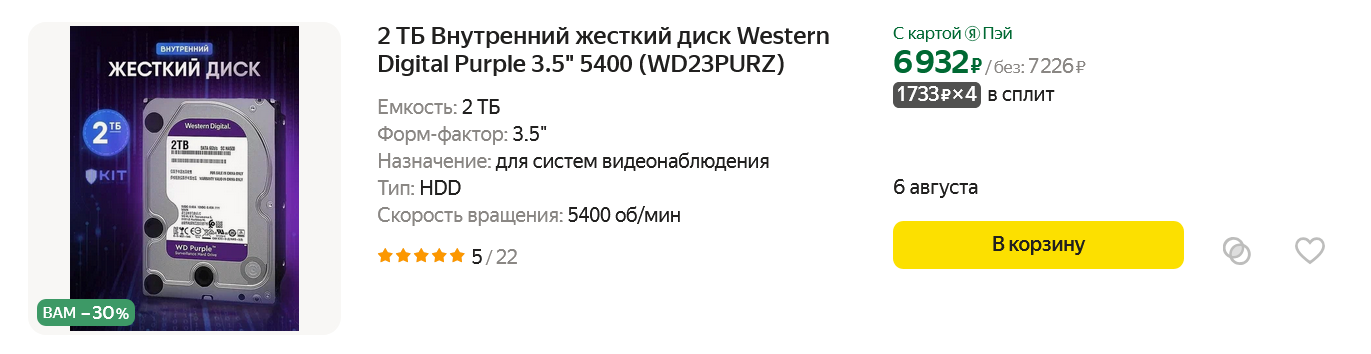 Поэтому как опцию, которая не войдет в финальную цену сборки, можно рассмотреть установку в этот компьютер жесткого диска объемом 2 ТБ, например, Western Digital Purple (WD23PURZ). Но перед его выбором обязательно изучите проблемы, которые имеют в 2024 году модели с типом записи SMR. Большая вероятность встретить классический, быстрый тип записи CMR есть в дисках серии Purple от Western Digital, так как они предназначены для видеозаписи.