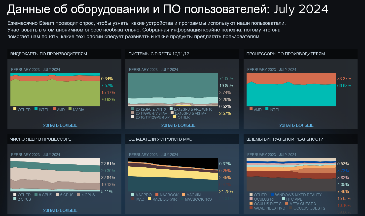 Первое, на что хотелось бы обратить ваше внимание, это расклад сил на рынке видеокарт, где заметно, что компании AMD удалось немного выправить ситуацию и нарастить свою долю в игровых ПК. Если совсем недавно статистика рисовала плачевную для AMD ситуацию, где видеокарты этой компании были лишь у 11.5% геймеров, а видеокарты конкурента, компании Nvidia — у 82.2%, то сегодня расклад сил уже не такой пугающий. Доля "красных" составляет 15.17%, "зеленых" — 76.92%, а "синих", компании Intel, которая стала третьим игроком на рынке со своими Intel Arc — уже 7.57%.