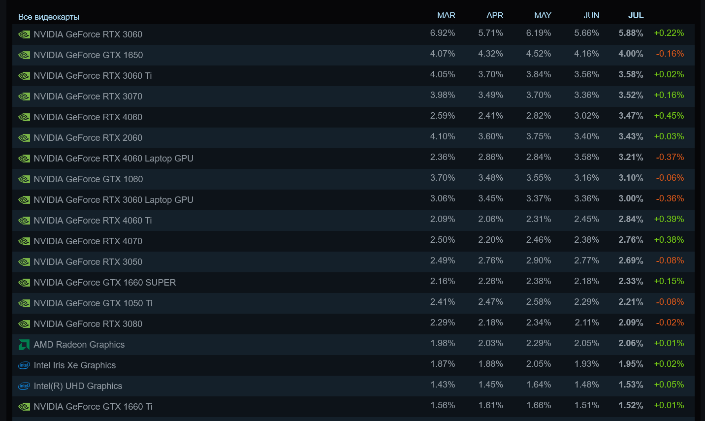 Если же взглянуть на самые популярные у геймеров видеокарты, то видно, что GeForce RTX 3060, которая находится на вершине списка популярных моделей уже много месяцев, стоит в компьютерах 5.88% пользователей сервиса Steam. Заметно более слабая GeForce GTX 1650, которая, тем не менее, довольно долго была на первом месте, занимает сегодня долю в 4%. И заметно, как быстро на вершину списка популярных видеокарт продвигается GeForce RTX 4060, которая уже располагается на пятом месте с долей 3.47%. Видеокарт от AMD в верхних строчках рейтинга не видно совсем, и только на 16-м месте располагается встроенная графика AMD Radeon Graphics. Кстати, про сборки с процессорами AMD со встроенной графикой у меня недавно вышел блог — "Играем за копейки — три выгодные ультрабюджетные сборки ПК в августе 2024 года".