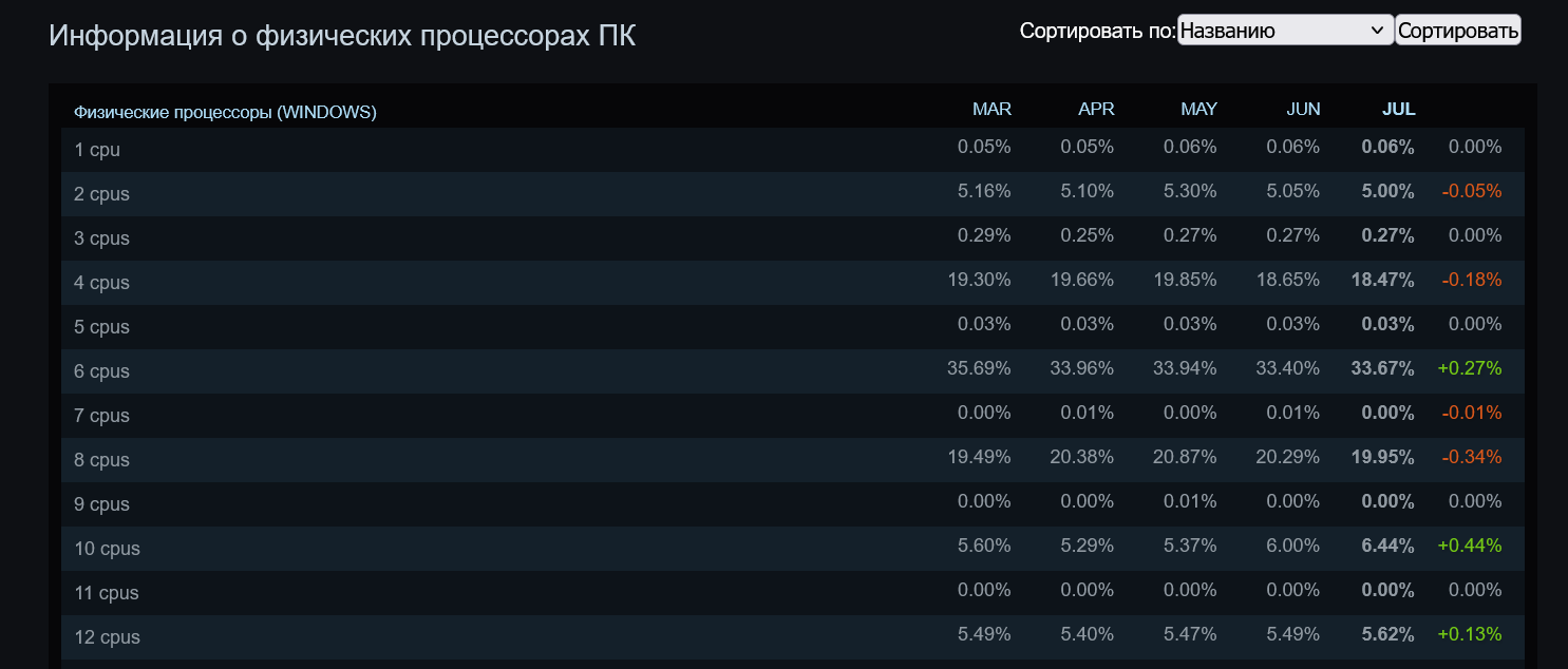 Что касается процессоров, то можно видеть в таблице, что продолжают доминировать и наращивать свою долю на рынке модели с шестью ядрами, которые стоят в практически в каждом третьем игровом ПК. Четырехъядерники стоят лишь у 18.47% пользователей сервиса Steam, и почти такую же долю занимают восьмиядерники — 19.95%. Но учитывая то, что модели с несимметричными ядрами есть уже и у AMD, а на процессорах Intel разделение на производительные P-ядра и энергоэффективные E-ядра, произошло уже более двух лет назад, понять то, как на них реагирует телеметрия Steam, пока непонятно.