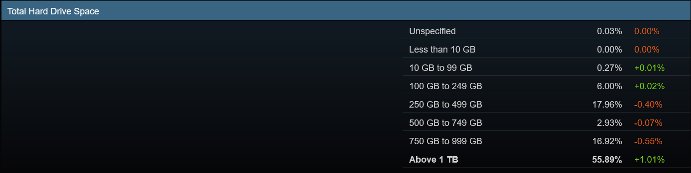 А еще очень интересно взглянуть на подраздел статистики, показывающий объем накопителей в геймерских ПК. Здесь видно, что более половины или 55.89% пользователей Steam имеют объем накопителей более 1 ТБ и число таких пользователей быстро растет. Но и здесь пора бы уже делать разделение в статистике на SSD и HDD накопители, ведь многие геймеры не спешат отказываться от классических жестких дисков, которые в ряде задач все еще заметно предпочтительнее твердотельных. Это и стоимость одного гигабайта объема, и очень высокий ресурс записи, который закончится только с выходом из строя HDD, а еще — возможность долгое время сохранять записанные данные при отключенном питании.
