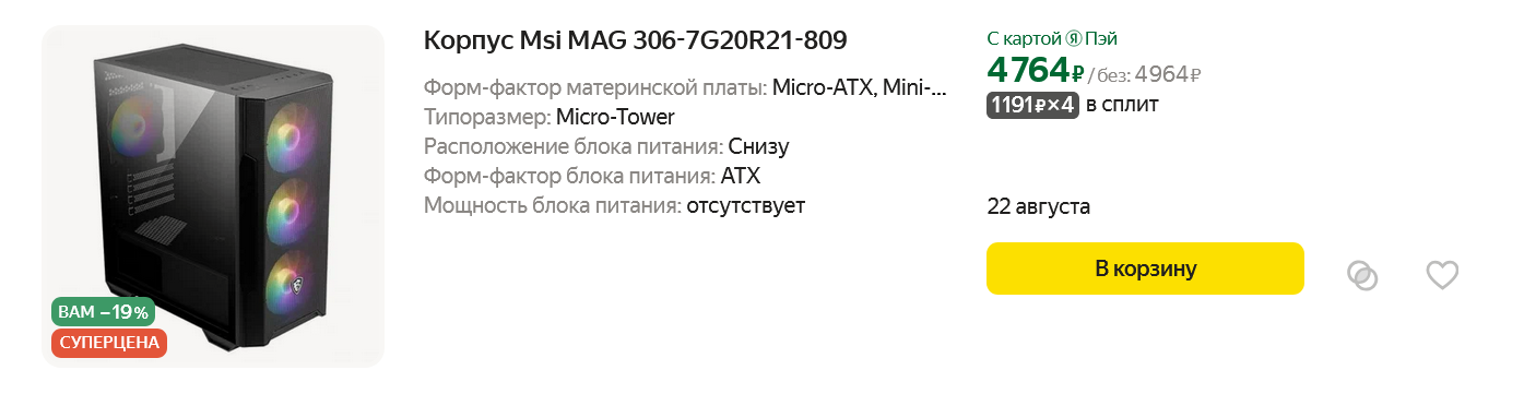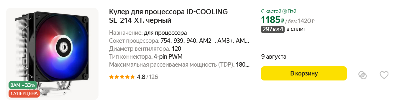 Выбирая товары для этого ПК на Яндекс Маркете, я наткнулся на очень дешевый кулер ID-COOLING SE-214-XT с пометкой "СУПЕРЦЕНА" и, как выяснилось потом, комплектующих со столь большой скидкой продается сегодня очень много и подобный ценопад позволит нам очень серьезно сэкономить при сборке этого ПК. Что касается кулера ID-COOLING SE-214-XT — это отличная модель с четырьмя теплотрубками, которая без проблем охладит Core i5-12400F, который даже при отключении лимитов потребляет в тяжелых задачах около 90 ватт.