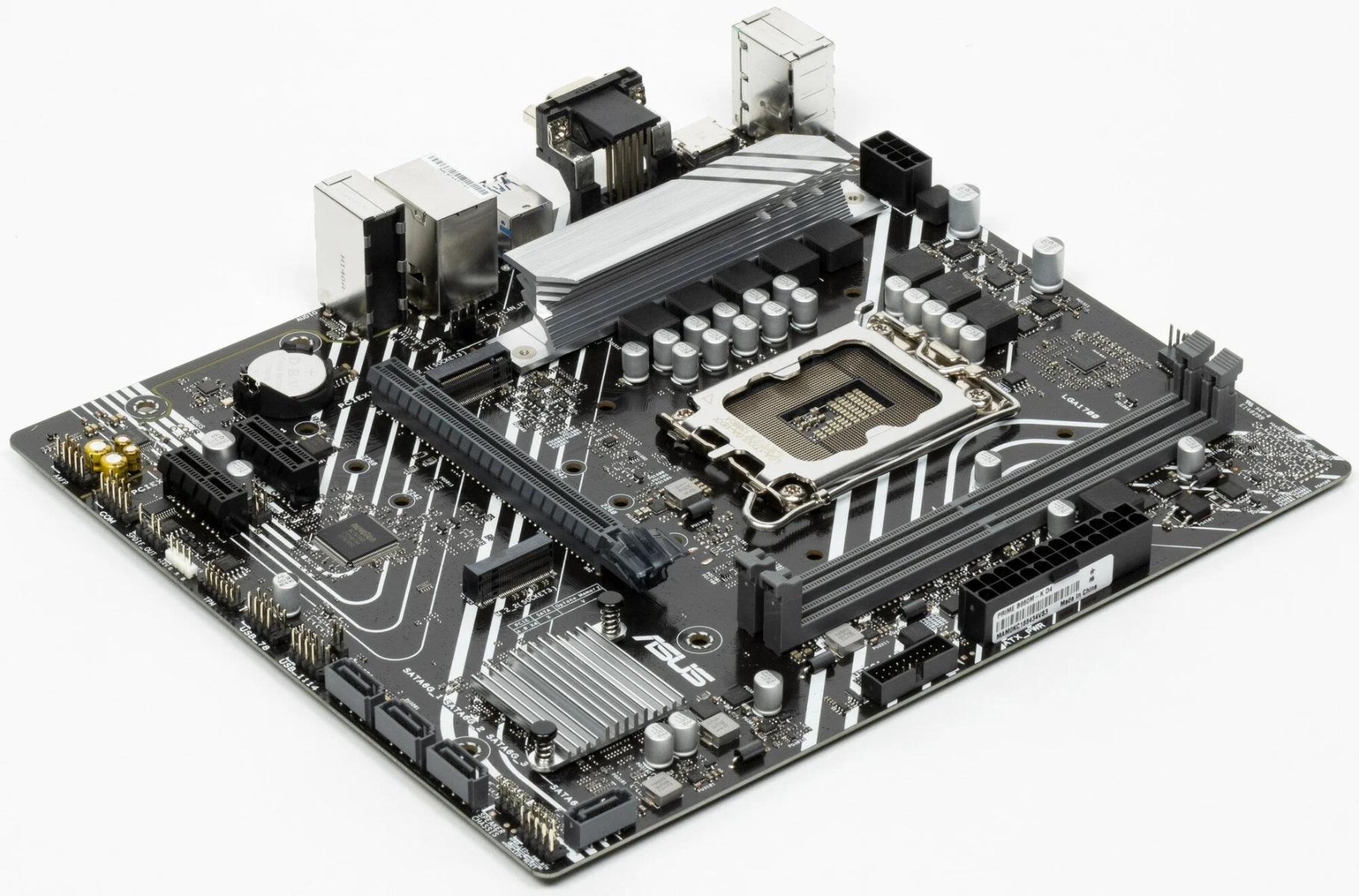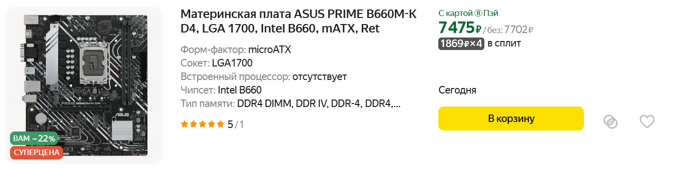 Но, все-таки 90 ватт это слишком много для материнских плат без радиатора на системе питания и с Core i5-12400F они будут просто кипеть, поэтому наше выбор — добротная плата на чипсете Intel B660, ASUS PRIME B660M-K D4. И глядя на столь низкую цену, сразу вспоминаешь старые добрые времена, когда доллар стоил 50-60 рублей, а цены на игровые компьютеры еще не вызывали шок.