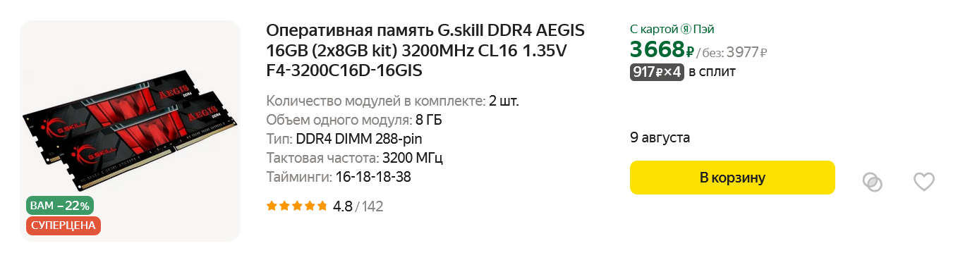 Еще одна выгодная покупка со скидкой — комплект из двух модулей оперативной памяти с частотой 3200 МГц, G.skill AEGIS F4-3200C16D-16GIS, общим объемом 16 ГБ и неплохими таймингами 16-18-18-38. За более высокой частотой с процессором Core i5-12400F лучше не гнаться из-за ограничений платформы LGA 1700, на которой высокочастотная оперативная память гарантированно работает только на процессорах с разблокированным множителем.