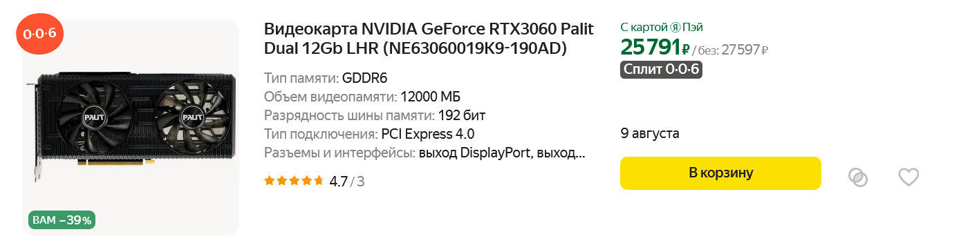 Даже несмотря на выход видеокарт GeForce RTX 4000-й серии старая добрая GeForce RTX 3060 остается отличным выбором по соотношению цены и производительности. Да, ест она гораздо больше, чем GeForce RTX 4060, но у нее на треть больше более быстрой видеопамяти, а подключена она по 16-ти полноценным линиям PCI Express 3.0. То есть, GeForce RTX 3060 будет с полной отдачей работать и в старых ПК с процессорами Ryzen 3600, работающих в материнских платах с чипсетом AMD B450 или Core i5-10400F. И вы только посмотрите на цену этой видеокарты! Palit GeForce RTX 3060 DUAL за 25791 рубль не оставляет никаких шансов конкуренту — Radeon RX 6600, да и по сравнению с новинками выглядит отличным выбором.