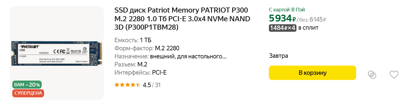 Купив в свой ПК еще один SSD-накопитель объемом 1 ТБ, но уже не SATA, а M.2 NVMe, я понял одно — гнаться за скоростью SSD в обычном игровом ПК нет никакого смысла. Гораздо практичнее будет выбирать больший объем и более длительный срок гарантии, а разницу в загрузке игр между бюджетным и топовым SSD вы не заметите без специальных замеров. Поэтому наш выбор — недорогой SSD Patriot P300 P300P1TBM28 объемом 1 ТБ и со вполне приличным скоростями, 2100 МБ/с на чтение, и 1650 МБ/с на запись. Ресурс перезаписи (TBW) у этой модели равен 480 ТБ, и, учитывая то, что у нас будет стоять еще и жесткий диск, на который можно качать торренты и установить нетребовательные игры — этого хватит надолго.
