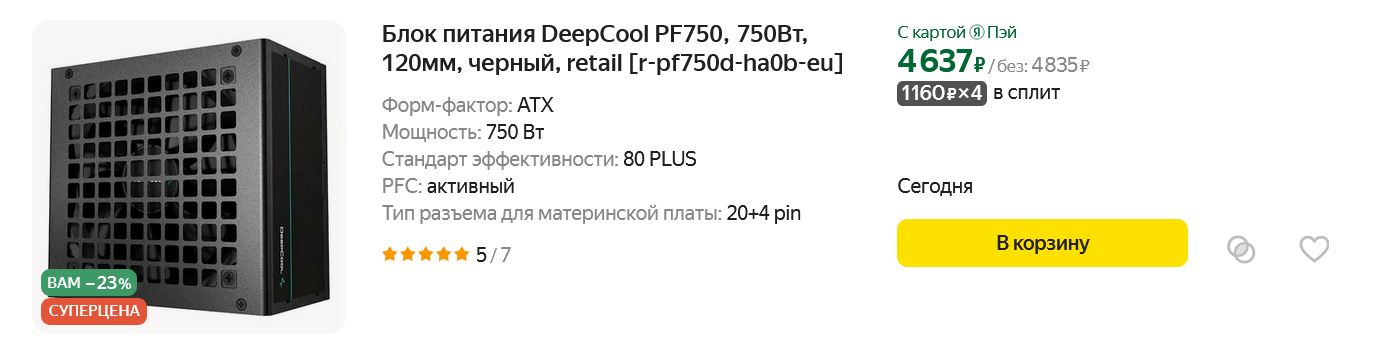 Продолжая искать комплектующие для этой сборки, я думал выбрать для нее блок питания мощностью 500-550 ватт, но, увидев DeepCool PF750 мощностью 750 ватт всего на несколько сотен рублей дороже, чем DeepCool PF550, не смог устоять. Такая мощность, конечно же, никогда не понадобится нашему ПК, который будет потреблять максимум 350 ватт, но этот запас мощности обеспечит низкий нагрев блока питания, невысокий уровень шума и его потенциально гораздо более длительную работу за счет продления жизни конденсаторов, которые не любят перегрев.