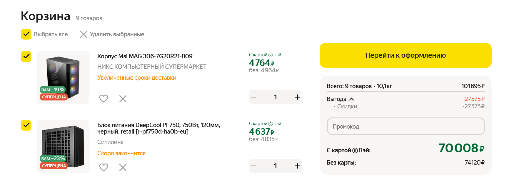 Итак, компьютер полностью собран, и он обойдется всего в 70008 рублей с картой Пэй или в 74120 без нее. И даже приблизительно оценивая объем скидки "СУПЕРЦЕНА" на Яндекс Маркете, мы экономим более 5000 рублей по сравнению с покупкой таких же комплектующих в обычных магазинах электроники. Этот ПК без проблем справится со всеми новыми играми и мне кажется его единственный недостаток — это всего 16 ГБ оперативной памяти. В 2024 году хотелось бы видеть 32 ГБ в такой сборке, но ведь мы пытаемся собрать самый популярный ПК по статистике Steam.