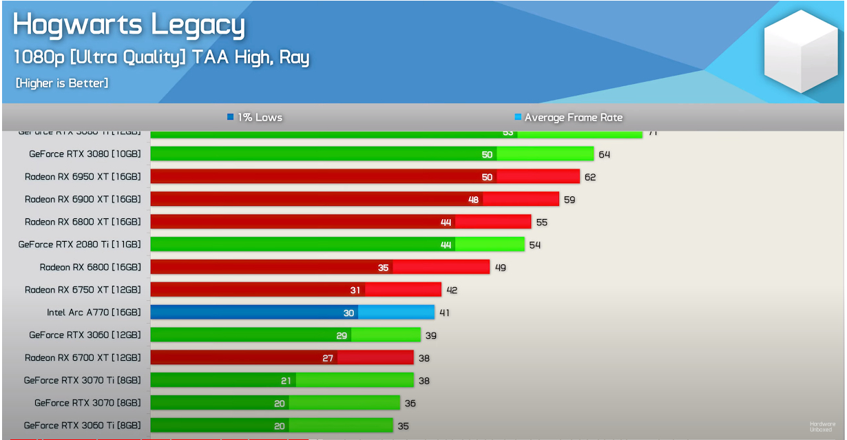 А тем геймерам, кто пишет в интернете о том, что современным играм хватает 8 ГБ видеопамяти, можете показать вот этот скриншот из тестирования игры Hogwarts Legacy, где GeForce RTX 3060 с 12 ГБ обошла даже GeForce RTX 3070 Ti в разрешении 1920х1080 точек.