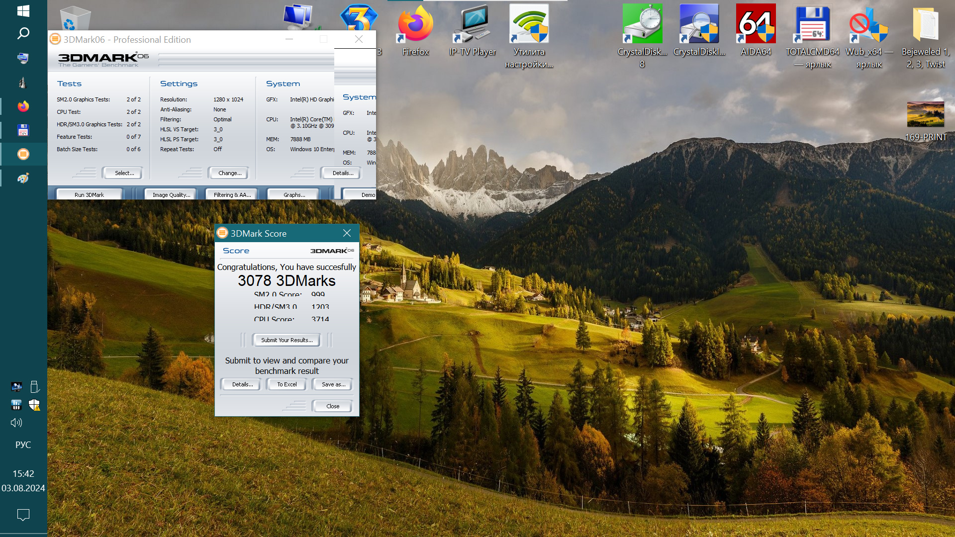 После того, как я установил на этот ПК Windows 10 и все нужные программы, я решил узнать, на что способно графическое ядро Intel HD Graphics 2000 в этой конфигурации, ведь ее производительность зависит еще и от скорости и таймингов оперативной памяти и ее объема. Для этого я запустил графический бенчмарк 3DMark06, так как запускать что-то более свежее для этой "встройки" будет слишком оптимистично. И у меня получились вот такие результаты, на первый взгляд весьма неплохие.