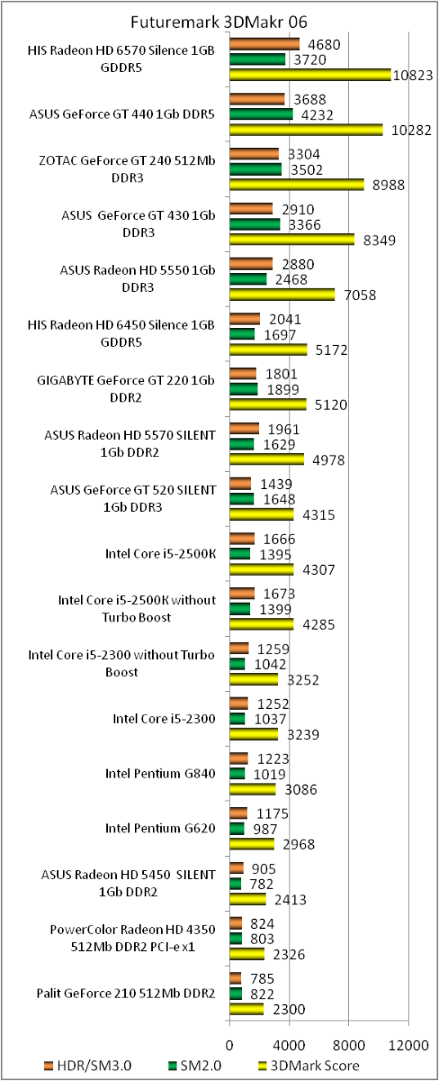 Но, присмотревшись к результатам, увидел, насколько мало значение SM2.0 Score — 999 очков. А HDR/SM 3.0 Score — 1203 очка. И получается, что такие большие общие баллы частично "набил" процессор, который заметно мощнее Athlon 64 или Core 2 Duo, которые были актуальны во времена активного использования 3DMark06. И если ориентироваться на параметр SM2.0 Score, то Intel HD Graphics 2000 даже не дотягивает до уровня таких ущербных видеокарт, как GeForce GT 520.