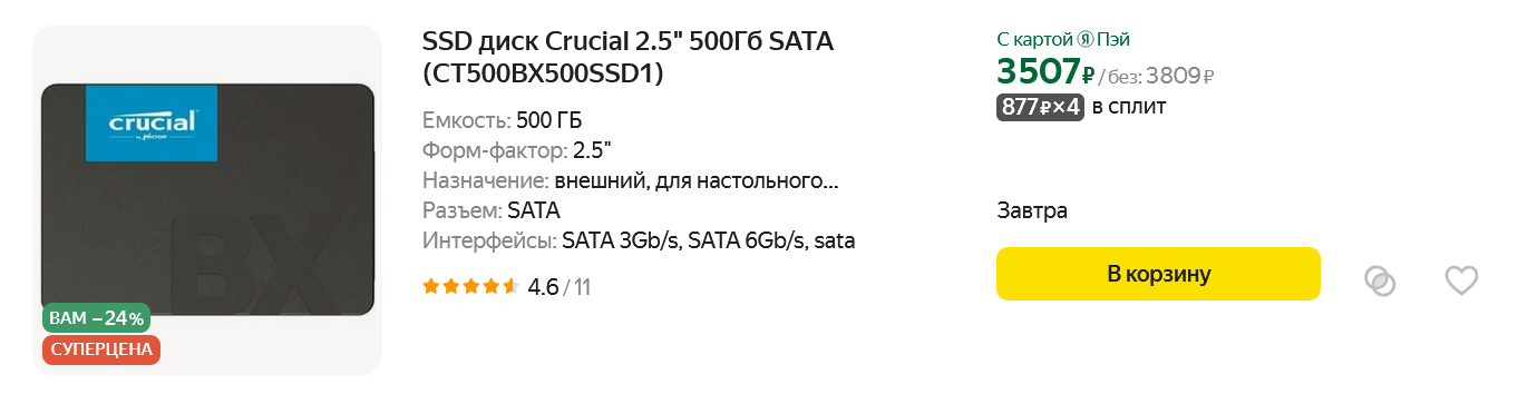 Crucial (CT500BX500SSD1) объемом 500 ГБ.