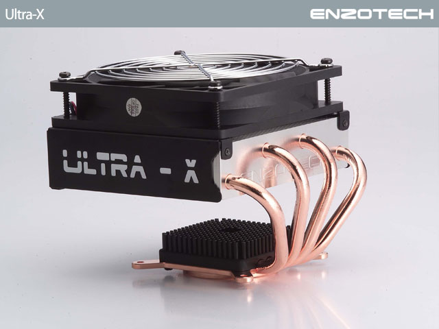 А вот весьма похожему на эту парочку экземпляров кулеру Enzotech Ultra-X это удалось, хотя в нем использовались только четыре теплотрубки, а их верхняя крышка тоже была выполнена в виде небольшого радиатора. Секрет этой модели — в большей толщине теплотрубок и качественной обработке основания кулера, что помогло Enzotech Ultra-X обойти Scythe Andy Samurai Master и Thermaltake Big Typhoon. Об этом писали в обзоре на нашем сайте, где все эти кулеры пытались охладить разогнанные процессоры Athlon X2 3800+ и Core 2 Duo Е6400.