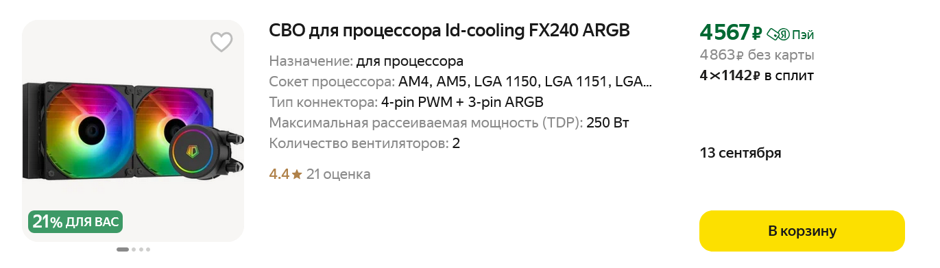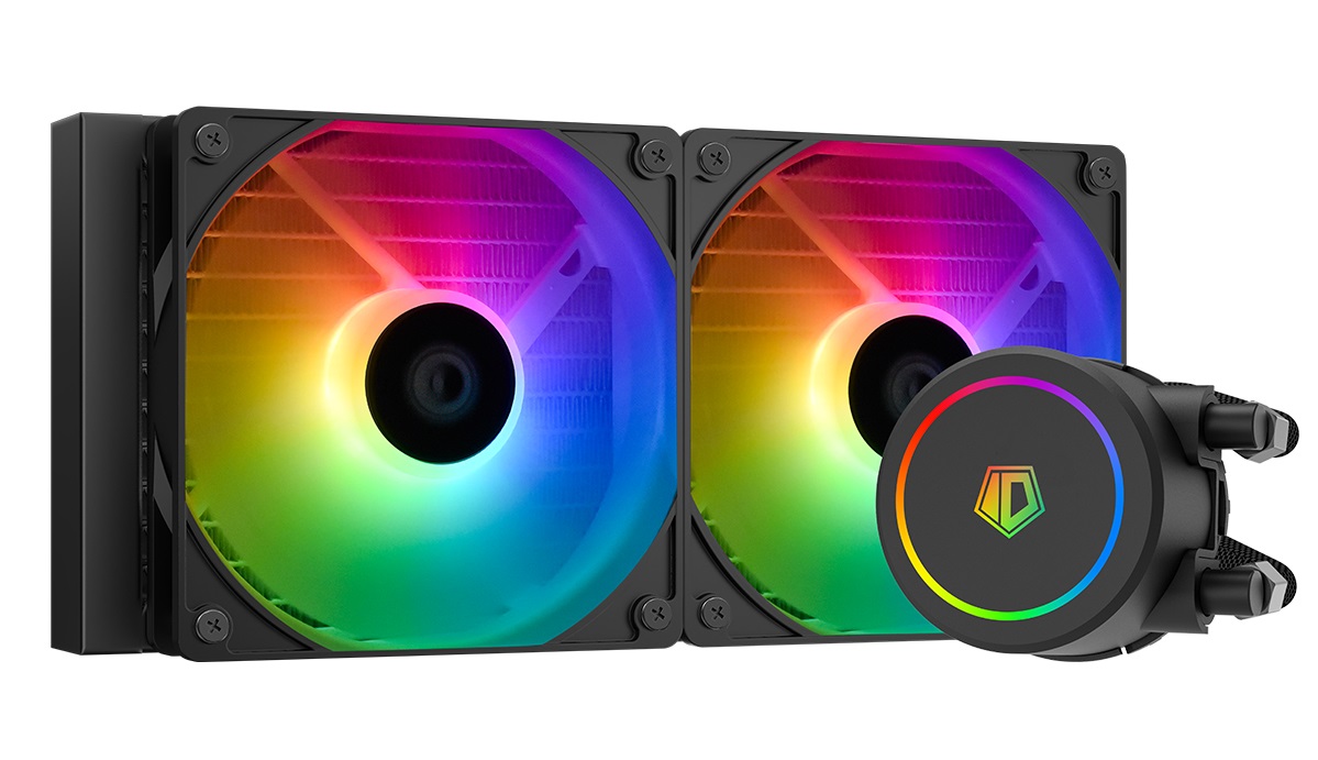 Поэтому в нашей сборке будет использоваться готовая система жидкостного охлаждения ID-COOLING FX240 ARGB, способная отвести от процессора 250 ватт тепла. Это двухсекционная СЖО и ее можно будет довольно легко разместить в корпусе, а еще это позволит вам выбрать приоритет температуры видеокарты или процессора. Хотите, чтобы процессор получал самый холодный воздух — ставите СЖО на переднюю стенку корпуса ПК, но в этом случае уже подогретый процессором воздух будет поступать к видеокарте.