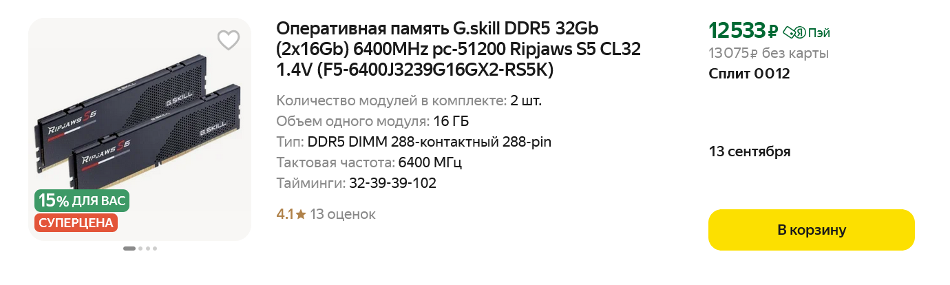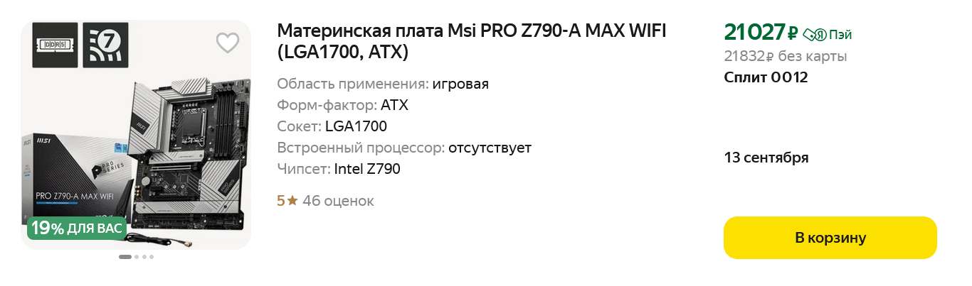 Думаю, многие читатели ожидали увидеть здесь процессор от AMD с 3D-кэшем — Ryzen 7 7800X3D, который показывает отличные результаты в играх при весьма скромном энергопотреблении. Но, таких предложений на Яндекс Маркете очень немного и велик шанс, что завтра вы не увидите этот процессор доступным для покупки. Да и цена на него кусается — отдать 50000 рублей только за процессор сможет далеко не каждый геймер, ведь тогда цена всего нашего ПК будет уже почти 200000 рублей. Поэтому мы возьмем более распространенный и доступный вариант — Core i5-14600KF.