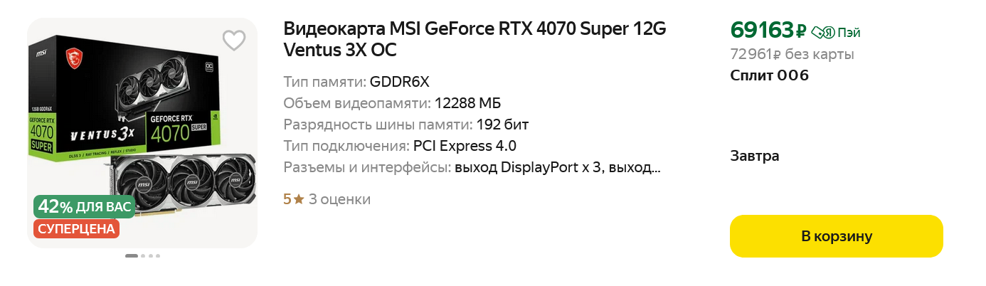 Одним из лучших соотношений цены и производительности в трассированных играх на сегодня обладает GeForce RTX 4070 SUPER и именно эту модель в версии MSI GeForce RTX 4070 SUPER 12G Ventus 3X OC мы и возьмем. Такой огромной системы охлаждения для видеокарты с тепловыделением 225 ватт хватает с лихвой и наша сборка будет работать тихо и при этом не перегреваться. Конечно, покупать видеокарты GeForce RTX 4000-й серии в конце их жизненного цикла выглядит не самым оптимальным решением, но, во-первых, выход GeForce RTX 5000 перенесли и ждать их придется еще долго. А во-вторых, никто не знает, что будет в следующем году с ценами, ведь и курс валют может подскочить, и эксперты предрекают дефицит на российском рынке электроники.