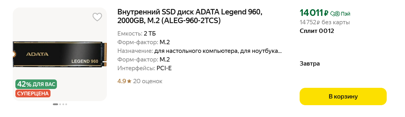 Теперь, когда основа нашего ПК готова, главное — не испортить его экономией на спичках, а это часто делают геймеры, беря в мощную игровую систему SSD небольшого объема. Размеры игр растут так быстро, что в 2024 году даже SSD объемом 1 ТБ уже хватает впритык, если не ставить ему в пару жесткий диск. Поэтому стоит ориентироваться на модели объемом 2 ТБ, которых хватит еще очень надолго, а стоимость одного гигабайта объема у них ниже, чем у SSD объемом 1 ТБ. Мы возьмем в эту сборку SSD ADATA Legend 960 объемом 2 ТБ — быстрый, надежный и не очень дорогой. Это модель с интерфейсом PCI Express 4.0, и из него ADATA Legend 960 выжимает максимум. Скорость чтения достигает 7400 МБ/с, а записи — 6800 МБ/с, а скорость случайной записи блоками по 4 КБ достигает цифры в 630000 IOPS. Очень высокий у этой модели и ресурс записи, составляющий 1560 ТБ и единственный минус этот SSD — слишком слабый радиатор, но, учитывая, что у нашей материнской платы есть массивные заводские радиаторы, это не проблема.
