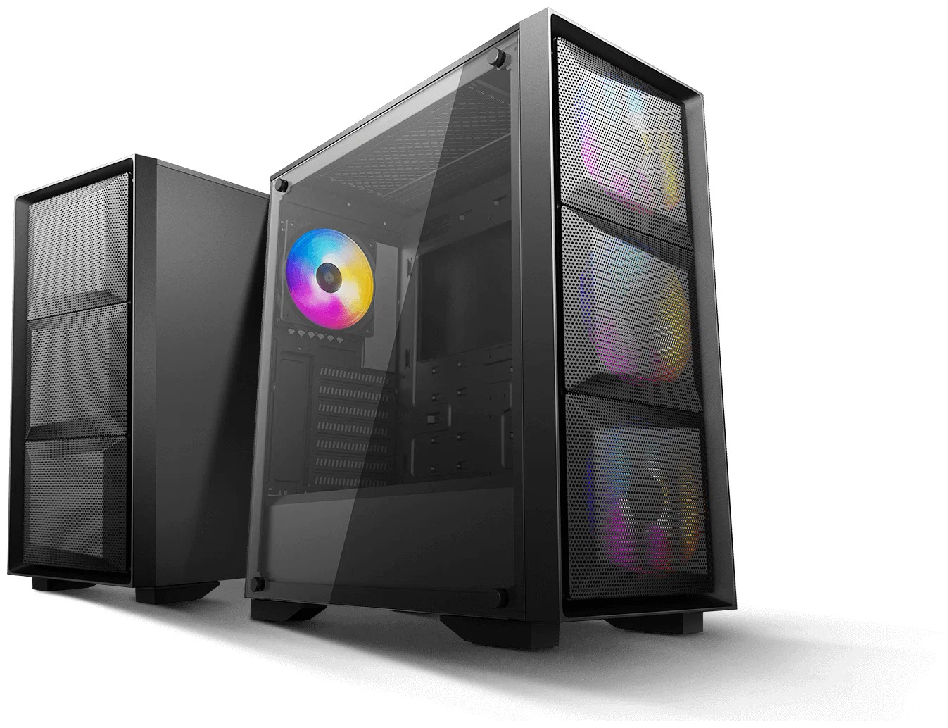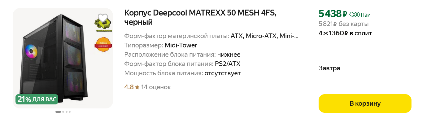 А вот на корпусе мы попробуем немного сэкономить, ведь стоимость ПК перевалит за 160 тысяч рублей. Тем более, что сегодня разница между дорогими и средними моделями корпусов часто не заметна совсем. И здесь отличным выбором станет корпус Deepcool MATREXX 50 MESH 4FS с четырьмя предустановленными вентиляторами диаметром 120 мм и отлично пропускающей воздух сетчатой передней панелью, которая еще и играет роль грубого пылевого фильтра. По крайней мере, шерсть вашего любимого кота эта сетка остановит. Не забывайте, что у нас будет использоваться СЖО с парой вентиляторов, так что общее количество вертушек в этом корпусе составит шесть штук. И с охлаждением Core i5-14600KF и GeForce RTX 4070 SUPER этот корпус справится отлично, а большое количество вентиляторов позволит уменьшить их обороты и, соответственно, шум.
