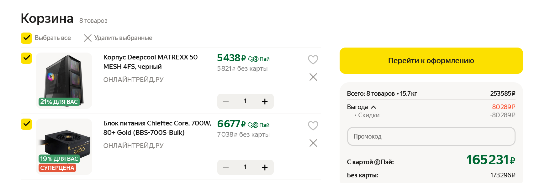 Итак, наш ПК собран и его цена получилась довольно высокой, но стоит учесть, что для игр его хватит еще очень и очень надолго, а никакой лишней роскоши мы себе не позволяли. С картой Пэй ПК будет стоить 165231 рубль, а без нее — 173296 рублей, экономия получается очень солидная. Интересно, сколько к этой сумме добавит игровой монитор с разрешением Full HD и высокой частотой развертки? Например, одним из самых популярных на Яндекс Маркете стал монитор MSI G274F диагональю 27", матрицей IPS и частотой развертки в 180 Гц. И даже с ним цена ПК не перевалит за 200000 рублей, что не может не радовать.