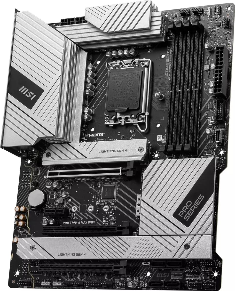 Экономить на материнской плате для процессора Core i5-14600KF тоже нельзя, ведь на моделях со слабой системой питания мы получим перегрев и троттлинг из-за ее высоких температур. Но и покупать материнскую плату стоимостью как сам процессор тоже не имеет смысла. Поэтому мы выберем золотую середину —довольно продвинутую плату MSI PRO Z790-A MAX WIFI на чипсете Intel Z790. На ней вам будут доступны целых четыре порта M.2, шина PCI Express 5.0, качественный звук Realtek ALC4080 и встроенные Wi-Fi и Bluetooth. Система питания у этой модели отлично подойдет для Core i5-14600KF — у нее схема из 16+1+1 фаз и массивные радиаторы. Радиаторами оснащаются и порты M.2, так что о перегреве SSD-накопителей тоже можно не беспокоиться. Одним словом, качественная материнская плата для игрового ПК, с которой вы не будете знать проблем лет пять, а то и больше.